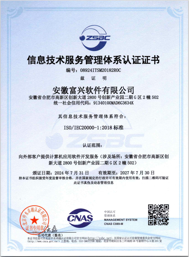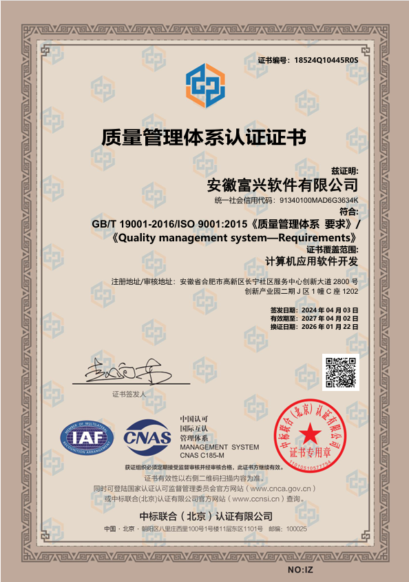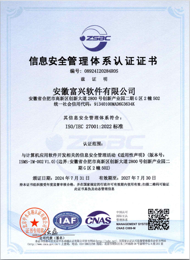 公司通过了ISO9001质量管理体系、ISO14001环境管理体系、ISO45001职业健康安全管理体系、ISO27001信息安全管理体系、ISO20000信息技术服务管理体系认证、CMMI3级认证、软件企业和软件产品认证,拥有先进的解决方案、成熟的软件平台和近百人经验丰富的专业技术团队。